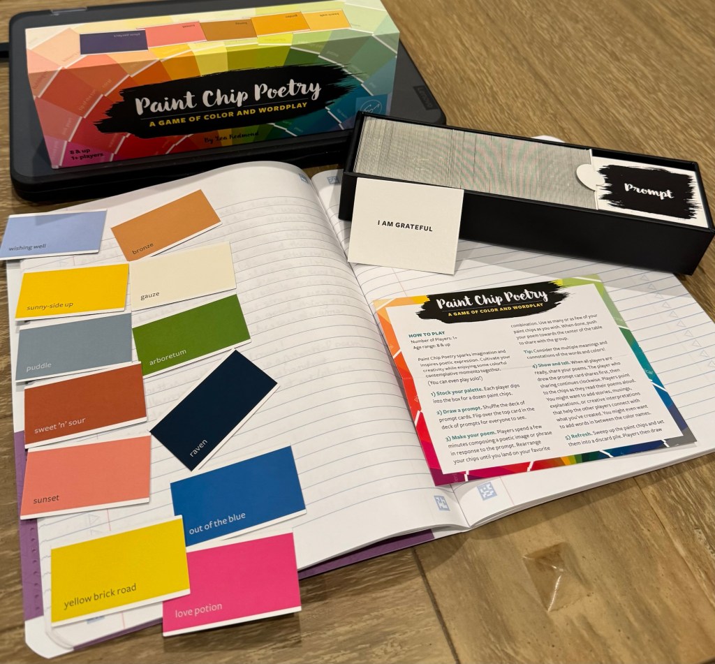 Each player arranges their paint chips however they want and creates a poem inspired by their chips. You don’t have to use them all, and you are free to change the color names slightly to make things flow better.