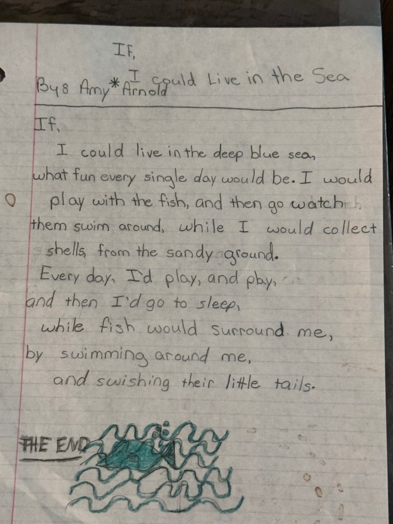 When Ms. Hawes announced she would be laminating our final poems and hanging them on the bulletin board in the hallway for everyone to see, I knew I had to do something extra special to make mine stand out from the rest of the class. I decided to draw a small blue fish swimming through waves of water below my poetic masterpiece.