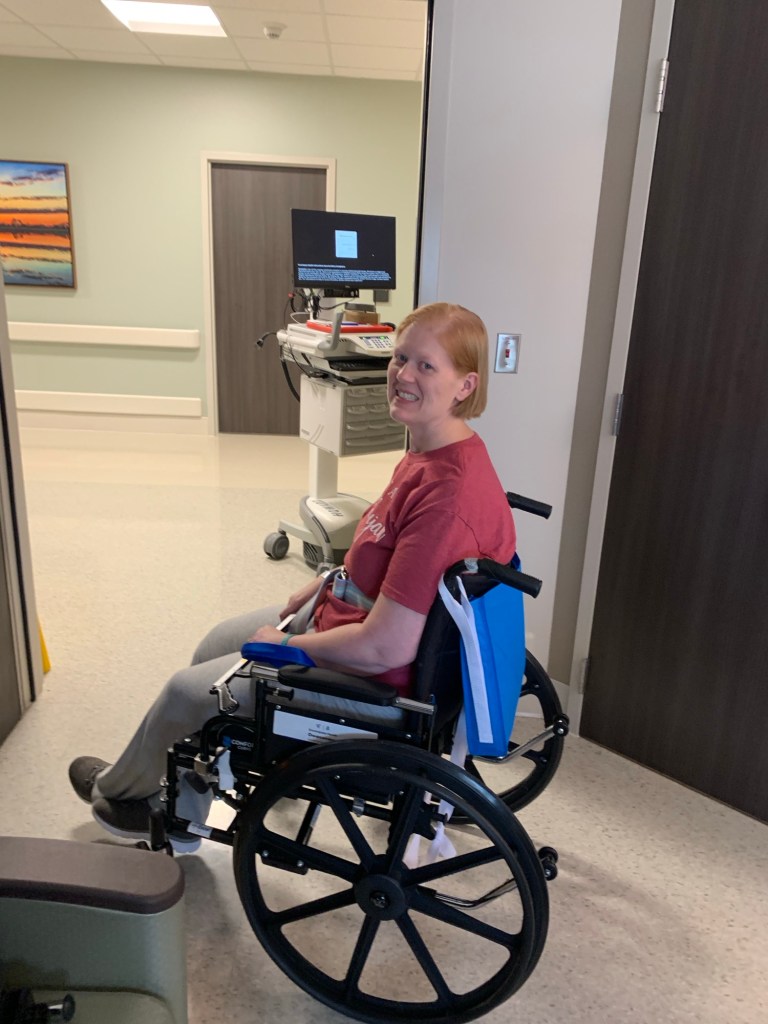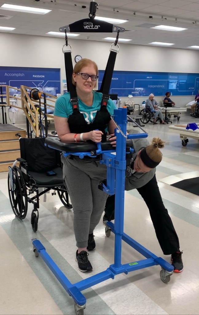 When I arrived at the new hospital, I couldn’t sit up unassisted, could barely hold my head up, had left neglect (which means I wasn’t aware of and couldn’t see anything to my left), and was fully paralyzed on the left side of my body. I had essentially been in bed for about two weeks.